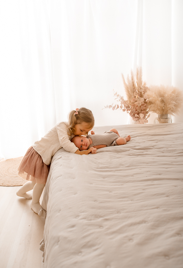 Die große Schwester war unglaublich liebevoll. Vorsichtiges Kuscheln, kleine Küsschen auf die Stirn und ein stolzer Blick, der so viel sagt. Genau diese Augenblicke machen ein Neugeborenenshooting so wertvoll. Sie lassen sich nicht planen, sie entstehen einfach.